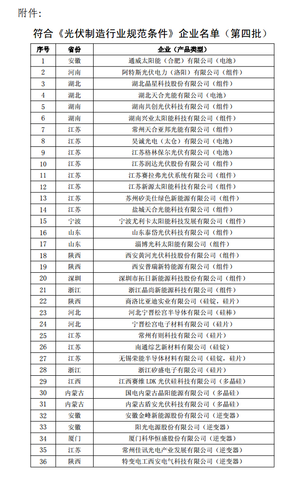 工信部公布第四批符合《光伏制造行業規范條件》企業名單