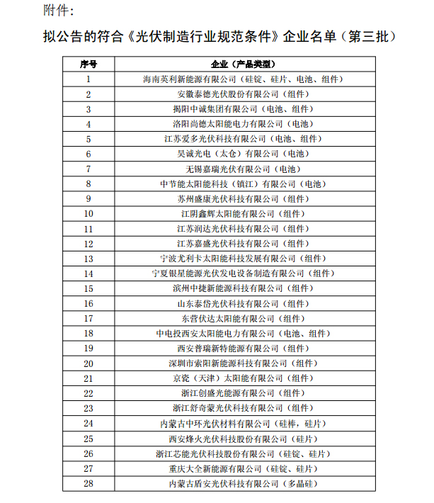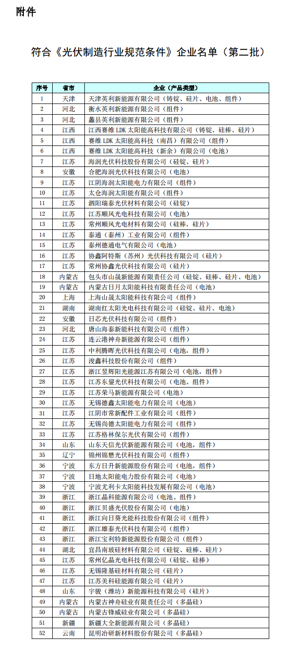 工信部公布第四批符合《光伏制造行業規范條件》企業名單