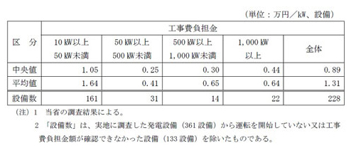 總務省在回答“認為施工費太高”或者“主要因為施工費太高而放棄運轉”的798套設備中任意抽出了361套,去掉尚未開始運轉或者無法確認施工費金額的133套設備,調查了剩余的228套設備的施工費金額。結果為,施工費中值在(1)輸出功率在10kW以上50kW以下時為1.05萬日元/kW;(2)輸出功率在50kW以上500kW以下時為0.25萬日元/kW;(3)輸出功率在500kW以上1000kW以下時為0.30萬日元/kW;(4)輸出功率在1000kW以上時為0.44萬日元/kW,全體的中值為0.89萬日元/kW。