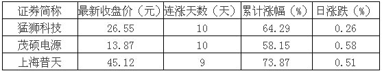 據(jù)證券時報股市大數(shù)據(jù)新媒體平臺“數(shù)據(jù)寶”統(tǒng)計,截至10月20日收盤,猛獅科技、茂碩電源、上海普天3只新能源行業(yè)相關個股近日已連續(xù)上漲多日,詳情如下:
