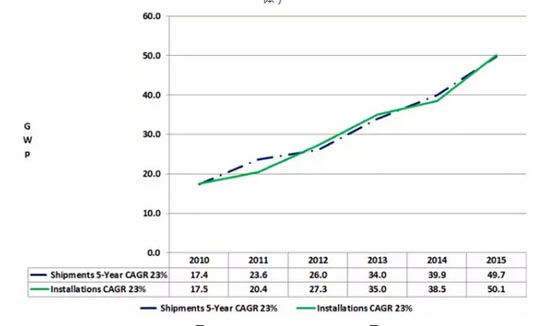 2010-2015全球太陽能光伏組件出貨量(數據統計范圍只限于第一手交易,買方包括安裝商、EPC、開發方、終端用戶、其他制造商、其他個體)
