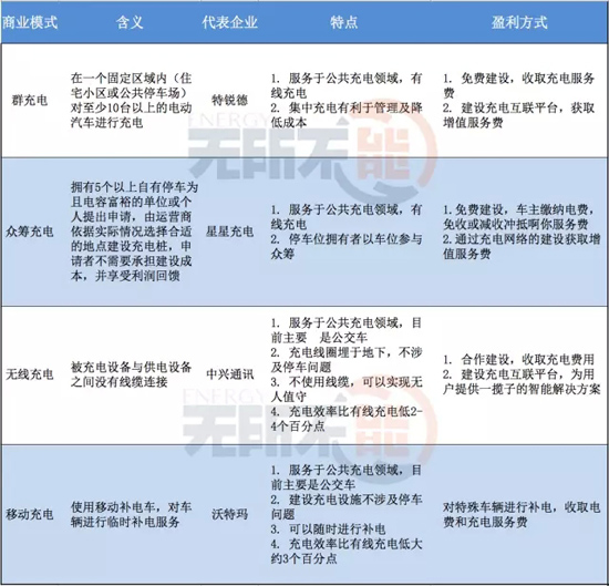 據(jù)國(guó)汽車技術(shù)研究中心、日產(chǎn)(中國(guó))投資有限公司、東風(fēng)汽車有限公司和社會(huì)科學(xué)文獻(xiàn)出版社聯(lián)合發(fā)布的《新能源汽車藍(lán)皮書》,目前,充電樁市場(chǎng)上有以下幾種比較具有代表性的商業(yè)模式: