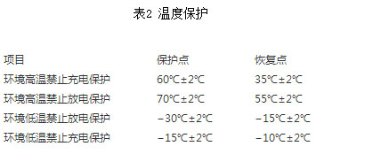 f、溫度保護。當溫度達到表2中保護點范圍時,電池組應切斷電路并告警;除電池組內部BMS元器件高溫保護外,溫度達到表2中恢復點范圍時,電池組應自動恢復工作;電池組應不漏液、冒煙、起火或爆炸。