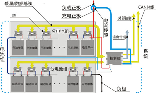 和分布式的看起來類似,這種系統由單體模塊(UM)、總線和控制器三部分構成。模塊為4端口,安裝在每串電池上,2個輸入端與電池正負極連接,2個輸出端連接在總線上。總線是2線制,每套總線可以連接一定數量的模塊。所有的模塊都并聯在總線上,數據和均衡的能量都通過總線與每串電池傳遞。因為象搭積木一樣,多個系統可以通過CAN總線連接構建成更大規模(百串級別)的電池組能量管理系統,積木式架構由此得名。