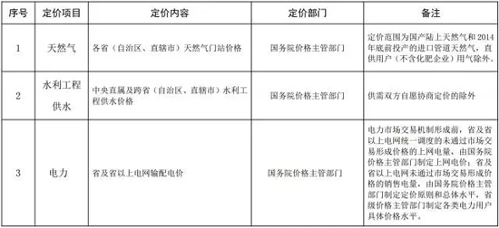 《中央定價目錄》經國務院批準,自2016年1月1日起施行。目錄顯示,天然氣定價內容為各省(自治區、直轄市)天然氣門站價格,定價部門為國務院價格主管部門。電力定價內容為省及省以上電網輸配電價,定價部門為國務院價格主管部門。