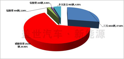 當(dāng)月所生產(chǎn)的純電動客車,采用磷酸鐵鋰動力電池的數(shù)量是14143輛,占據(jù)64.9%的份額,位居第一;三元材料動力電池的裝機(jī)量為6022輛,占總份額的27.6%;多元復(fù)合材料動力電池、錳酸鋰動力電池、鈦酸鋰動力電池所占當(dāng)月份額分別為4.55%、2.04%、0.93%。