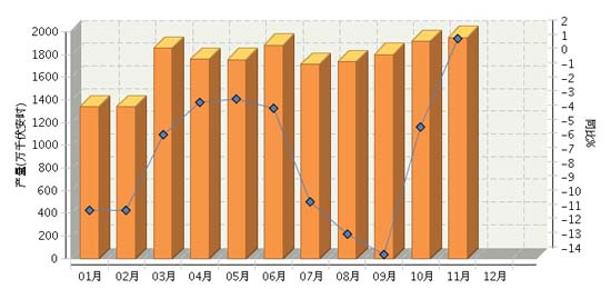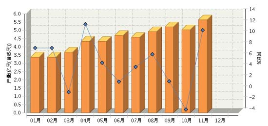 2015年1~11月,全國(guó)鋰離子電池行業(yè)累計(jì)完成產(chǎn)量同比增長(zhǎng)-0.57%。其中:11月份完成產(chǎn)量同比增長(zhǎng)-3.4%。2015年全國(guó)鋰離子電池行業(yè)月度產(chǎn)量及同比如上圖所示。
