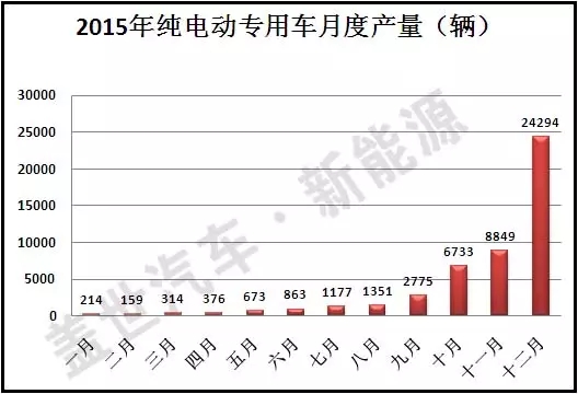 得益于國家政策和地方政策,純電動專用車的發(fā)展更加給力。其中1月份產(chǎn)量為214輛,2月份159輛,3月份314輛,4月份376輛,5月份673輛,6月份863輛,7月份1177輛,8月份1351輛,9月份2775輛,10月份6733輛,11月份8849輛,12月份24294輛。環(huán)比增長率分別為﹣26%、98%、20%、79%、28%、36%、15%、105%、129%、31%、175%。