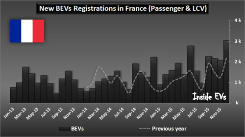 2015年12月份,純電動汽車銷量在法國創新高,銷量為3036輛(乘用車和輕型商用車)。
