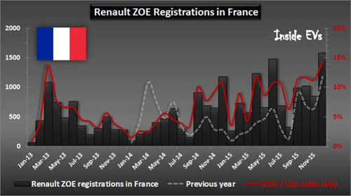 在法國,大部分純電動汽車的銷量來自法國雷諾,ZOE銷量最高點達到10407輛,Kangoo Z.E銷量最高點達到2836輛。