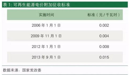 中國支持以風電和太陽能發電為代表的可再生能源快速發展的主要補貼資金來自可再生能源發展基金,包括國家財政年度安排的專項資金和依法征收的可再生能源電價附加(之后簡稱“電價附加”)。