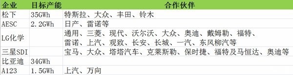 世界比較知名的電池制造商一般都集中在日、韓、中、美區(qū)域,除了上表提到的松下、AESC、LG等企業(yè)之外,還有江森自控、A123、PEVE(豐田與松下的合資公司)等。