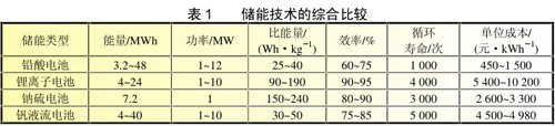 電化學儲能主要包括鉛酸電池、鋰離子電池、鈉硫電池、釩液流電池、鋅空氣電池、氫鎳電池、燃料電池以及超級電容器,其中鉛酸電池、鋰離子電池、鈉硫電池和液流電池是研究熱點和重點。表1對這幾種電化學儲能電池的各項參數做出了詳細對比。