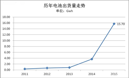2015年新能源汽車產量達37.9萬輛,伴隨其爆發式增長,電池出貨量也呈現較強走勢。從近5年動力電池走勢看,2014年之前,電池產量都低于1GWh,產量僅維持小幅增長。直到2014年動力電池出現小幅提升,達3.7GWh,再到2015年攀升至15.7Gwh,同比增長3倍之多。政策紅利激活私人消費市場,拉動新能源汽車爆發式增長,使得電池整體出貨量劇增。(注釋:以下動力電池數據源于新能源汽車產量與其搭載的電池容量乘積。由于未考慮其他影響因素,總體實際產能會略高于此。電池產量計算公式:車型搭載電池容量*車型產量)