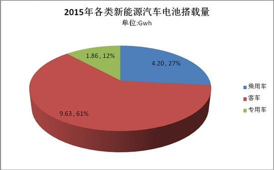 細分不同車型看,源于新能源客車對電池需求本身就高于其他車型,外加2015年各大車企追逐政策紅利,對新能源客車的產能傾斜(尤其是6-8米純電動客車),使得新能源客車搭載電池量依舊占據市場主力,達9.63Gwh,占全年總電池產量的61%;對應新能源乘用車搭載電池量為4.2Gwh,占比總量的27%;純電動專用車搭載電池量達1.86Gwh,占比僅10%。