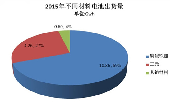 根據不同電池材料看,2015年磷酸鐵鋰電池出貨量達10.86Gwh,占據市場近69%份額;對應三元材料電池出貨量為4.26Gwh,占比27%;而對應錳酸鋰、鈦酸鋰、超級電容、鎳氫電池等其他材料電池出貨量僅0.6Gwh,占比4%。