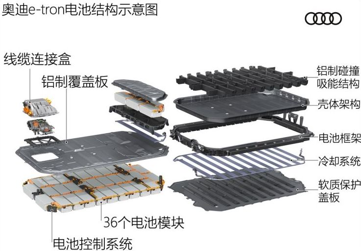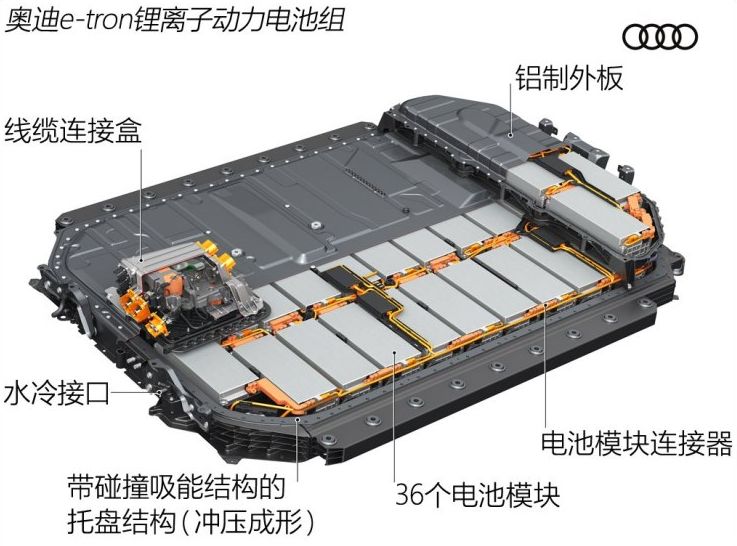 據(jù)此前報(bào)道,奧迪E-Tron的電池系統(tǒng)長(zhǎng)2.28米,寬1.63米,高34厘米,共包括36個(gè)電池模組(每個(gè)模組由12個(gè)60Ah的電芯組成,電芯由LG化學(xué)提供),電池組容量為95kWh,車輛工況續(xù)航里程400公里。